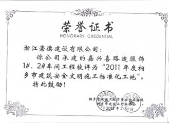 王庭世家2016年度標(biāo)準(zhǔn)化工地榮譽(yù)證書